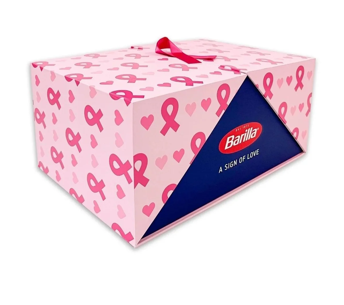 Redesigned blue pasta box with heart-shaped window, showcasing Barilla's new heart-shaped pasta