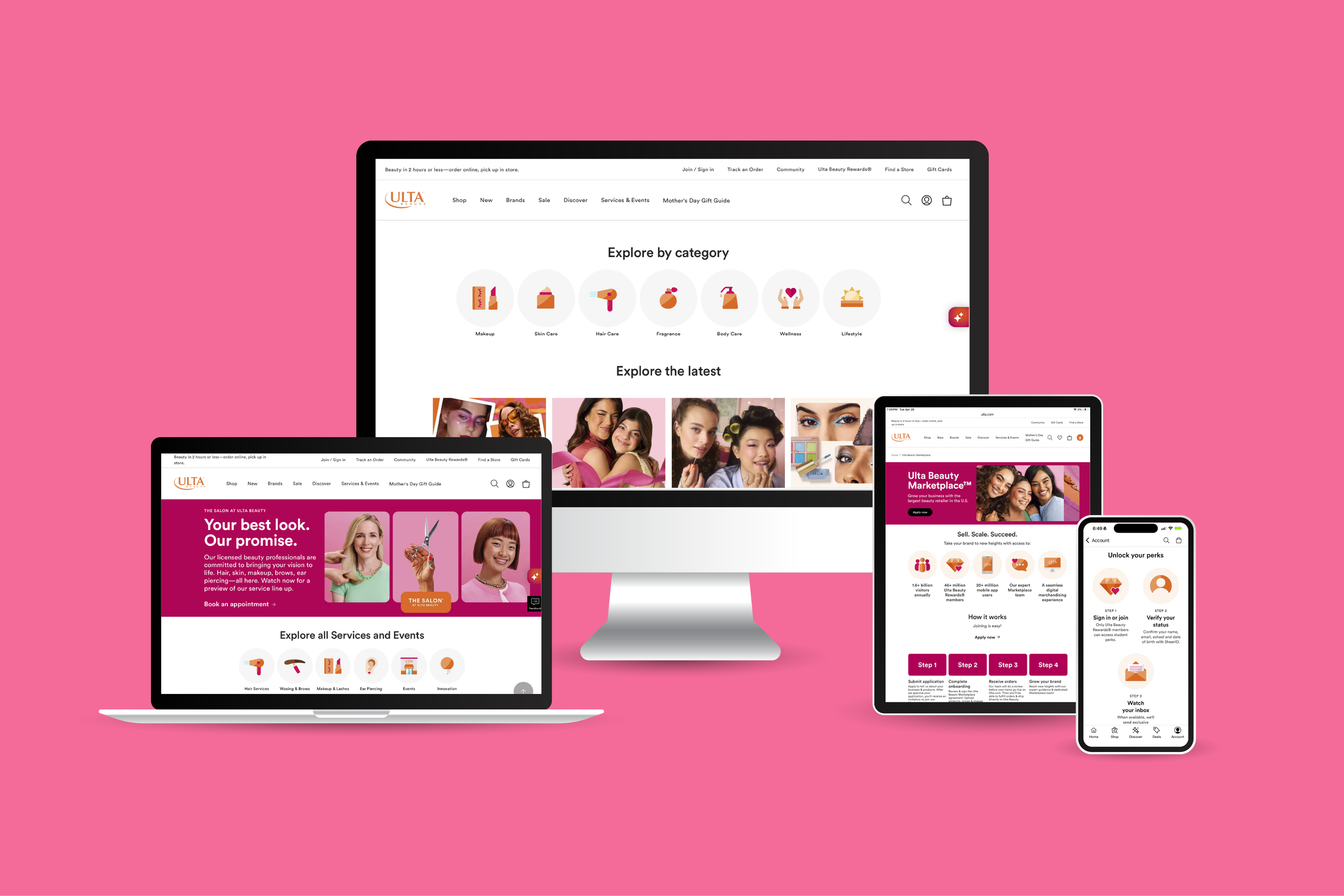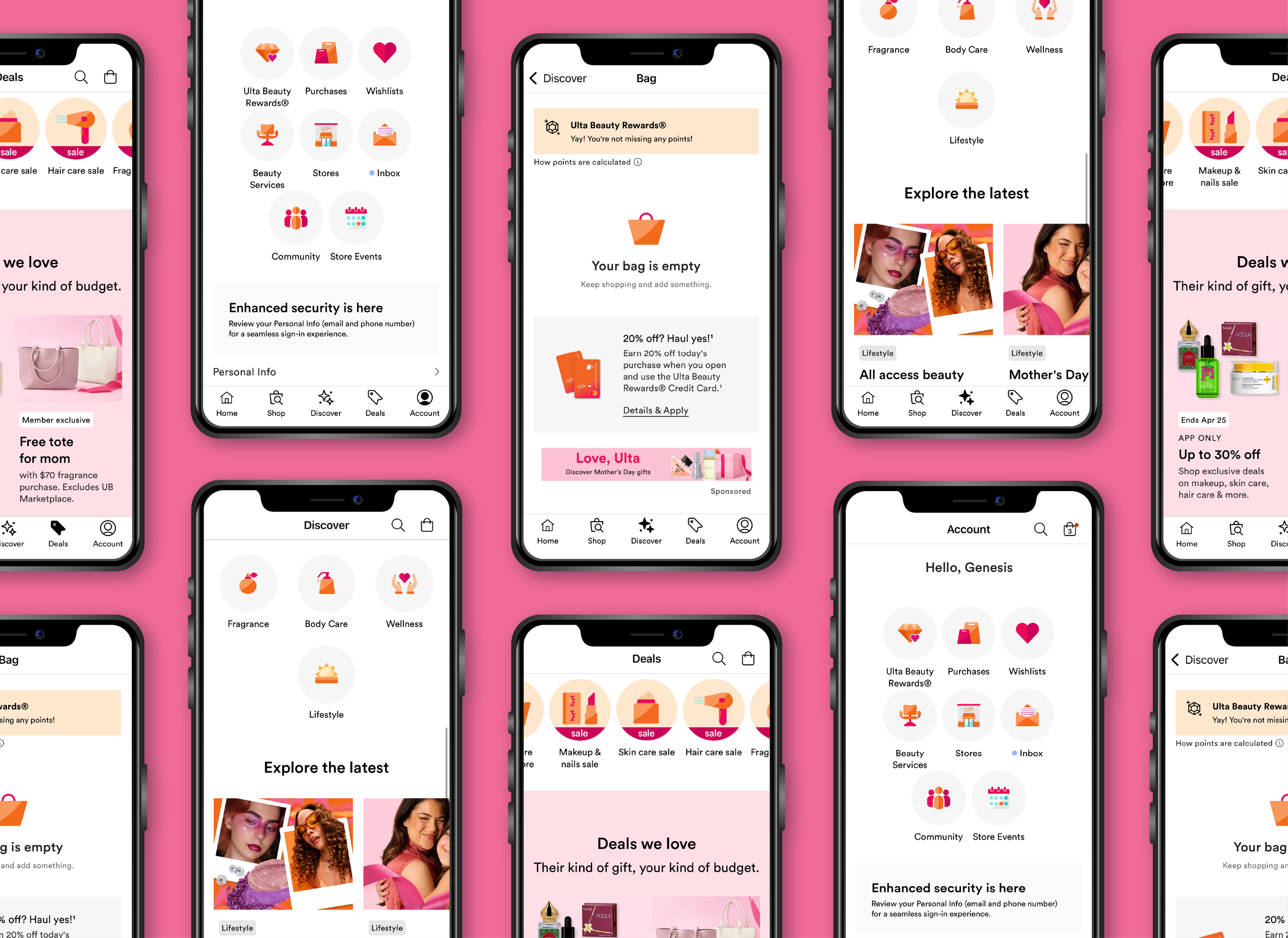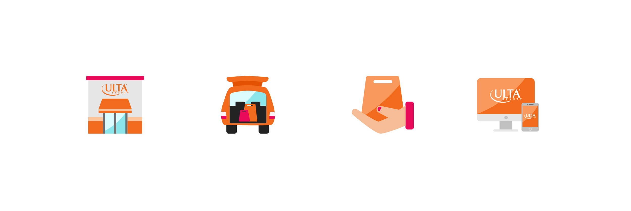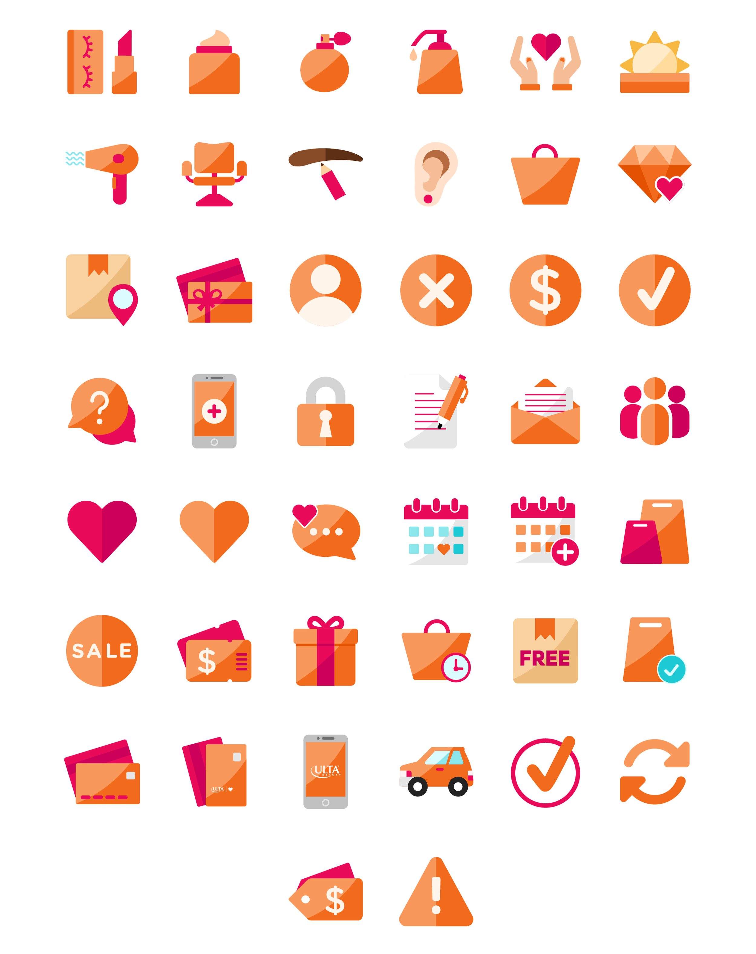 Each icon was designed with clean geometry, clear brand colors, balanced proportions, and subtle cues inspired by the signature swoop of the Ulta Beauty logo. Those details bring brand personality into everyday actions while keeping every symbol instantly recognizable. Whether leading users through rewards, salon services, favorites, or checkout, the icons work like tiny glam guides across the interface.